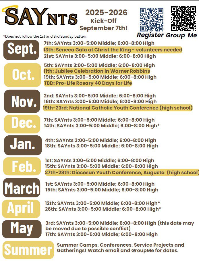 As we wait for the perfect timing of the Holy Spirit, we want to encourage you to check out St. Anne’s Youth Group, SAYnts.  Please consider this for your children – the SAYnts team does a wonderful job of engaging kids in Scripture and the Eucharist. This group is well-established and vibrant.  They have invited us to join as a Holy Family group, until such time that we can convene our own group of young people.